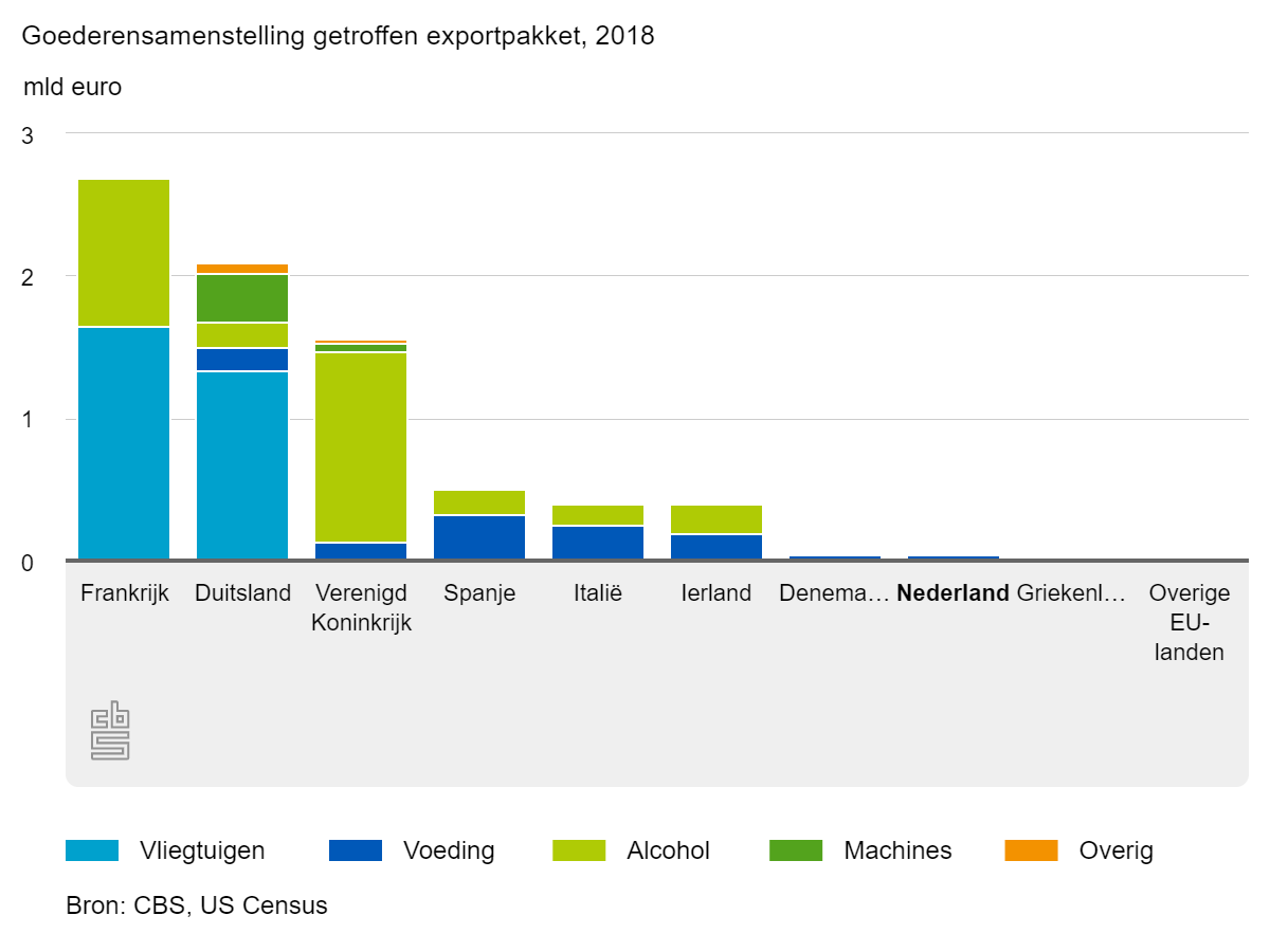 Donnald Trump dreigde met invoerheffingen op Franse goederen ter waarde van bijna €2,2 miljard. Deze heffing komt als reactie op de belasting die Frankrijk afgelopen zomer introduceerde op de omzet van internetreuzen. Vooral grote Amerikaanse bedrijven zoals Google, Facebook en Amazon worden hierdoor benadeeld. Frankrijk werd al eerder hard getroffen toen de Verenigde Staten in oktober heffingen invoerden op diverse Europese producten. Die heffingen waren een antwoord op de steun die een aantal Europese landen (Verenigd Koninkrijk, Spanje, Frankrijk, Duitsland) jarenlang verstrekt hadden aan vliegtuigbouwer Airbus. De Wereldhandelsorganisatie (WTO) oordeelde dat Airbus’ concurrent Boeing door die steun voor $7,5 miljard dollar was benadeeld en de Verenigde Staten daarom voor dit bedrag aan invoerheffingen tegen Europa mocht invoeren. Afgelopen week stelde de WTO in een rapport vast dat de Europese Unie te weinig gedaan heeft om deze ongeoorloofde overheidssteun aan Airbus ongedaan te maken. Washington mag nu met onmiddellijke ingang de geleden schade compenseren door importheffingen op te leggen op Europese exportproducten, waaronder Franse wijnen, Schotse whisky en Italiaanse en Nederlandse kazen. Vooral Frankrijk wordt geraakt en dreigt dan ook met tegenmaatregelen. De economische schade voor het Nederlandse bedrijfsleven is overigens relatief beperkt.