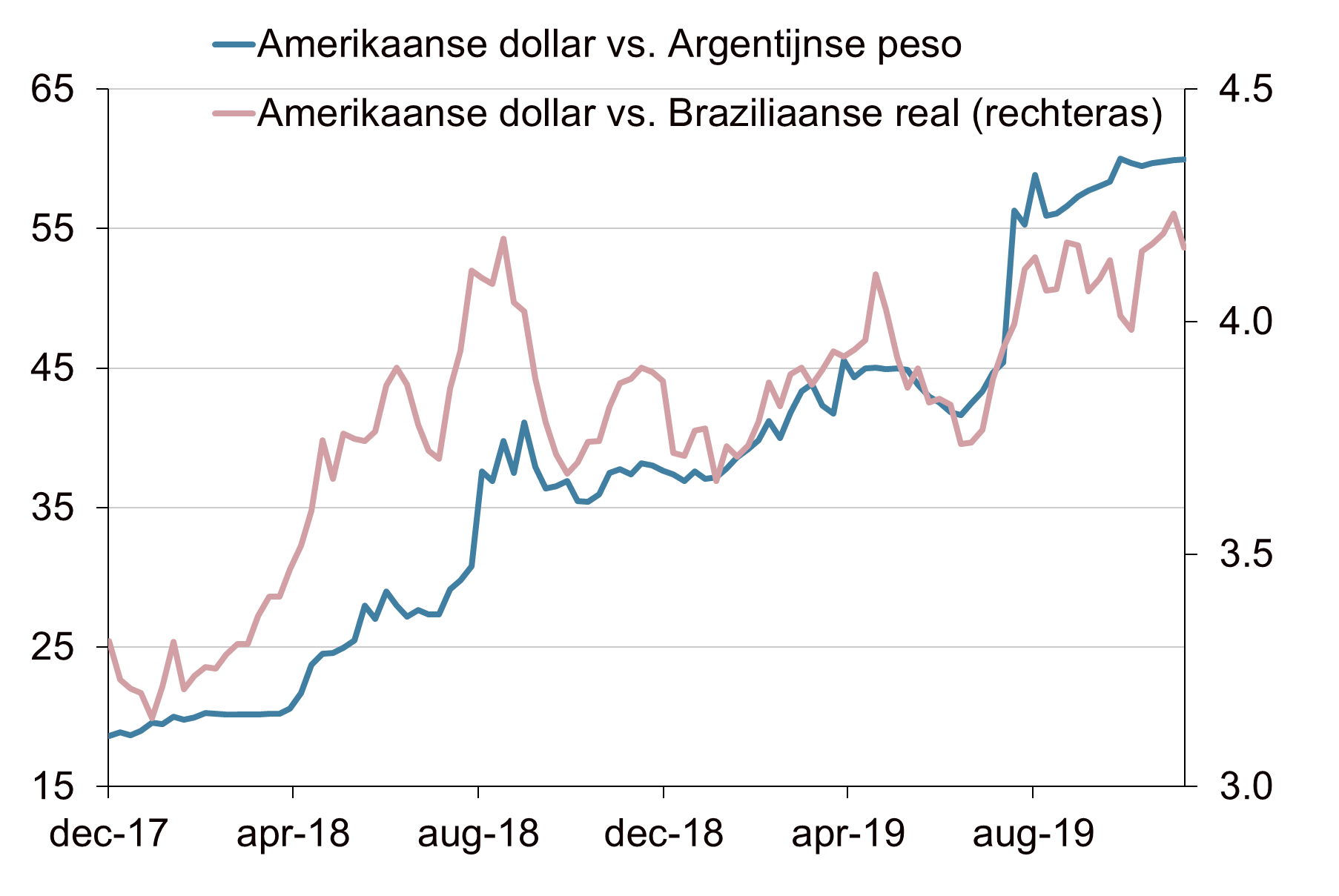Het positieve sentiment op de financiële markten werd aan het begin van de week ruw verstoord door een verrassende tweet van Donald Trump. De Amerikaanse president kondigde namelijk importtarieven aan op staal en aluminium uit Brazilië en Argentinië. Deze landen werden in 2018 nog vrijgesteld van de importheffingen op deze producten. De reden voor deze heffing is dat deze landen volgens Trump hun valuta bewust zouden devalueren ten opzichte van de Amerikaanse dollar. Dit zou vooral de export van de Amerikaanse boeren geraakt hebben, wier prijzen door de devaluatie van deze valuta’s veel minder concurrerend zijn geworden. Een opmerkelijke ommezwaai van Trump, aangezien de Verenigde Staten een jaar geleden nog een deal met deze landen sloot om hun vrij te stellen van deze tarieven. Daarnaast is het twijfelachtig of landen als Argentinië en Brazilië daadwerkelijk bewust aangestuurd zouden hebben op devaluatie van hun valuta. Bovendien heeft de sterke toename van export van bijvoorbeeld Braziliaanse sojabonen in vergelijking met Amerikaanse sojabonen weinig te maken met een goedkope munt, maar meer met het feit dat China deze bonen vanwege het handelsconflict niet meer in de Verengde Staten wilde kopen.